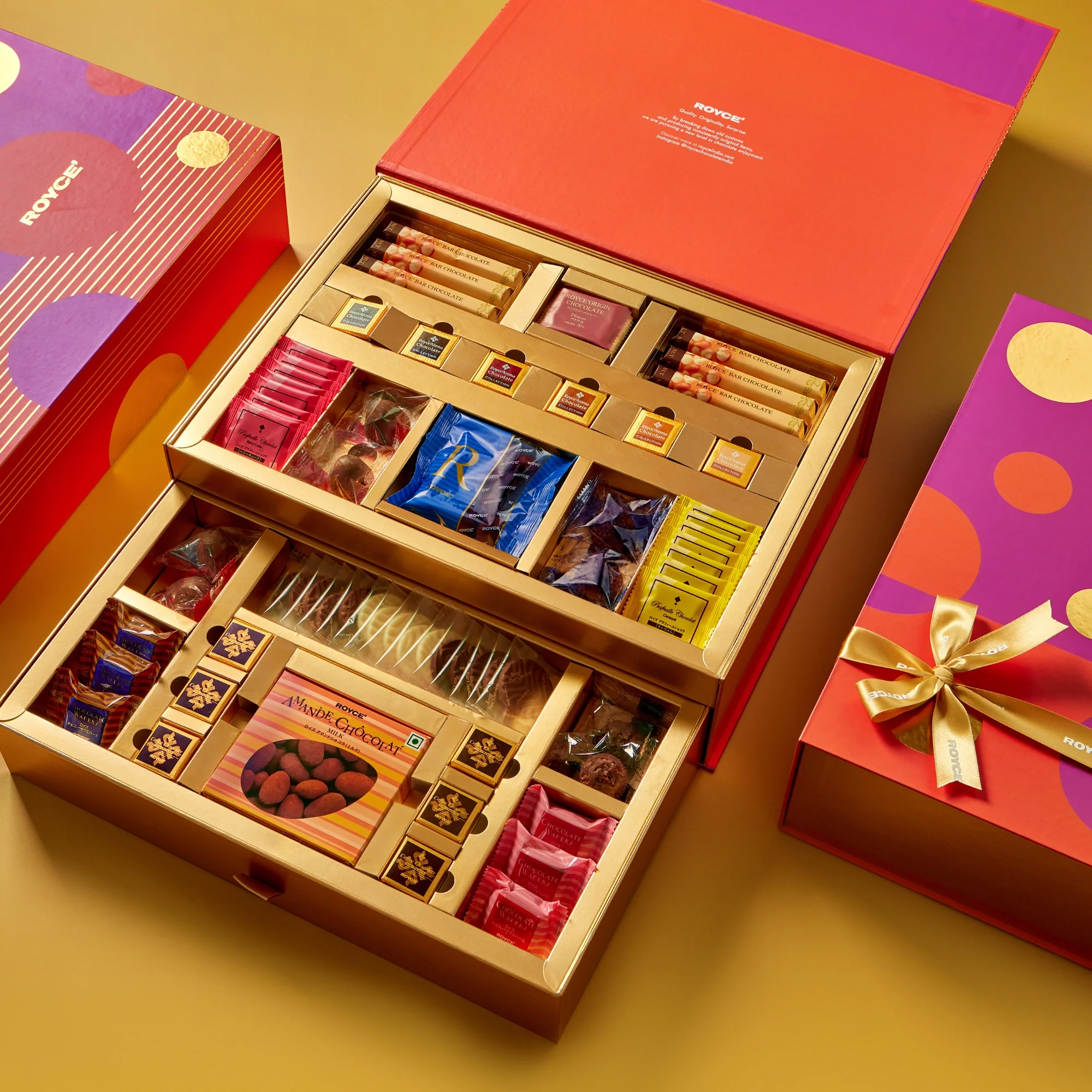 Two-tiered with a pull-out drawer, this gift box elevates gifting all the way! A tantalising experience awaits as you discover our most sought-after chocolate creations - from nutty to fruity, milk to dark. With more than ten varieties, this gift box offers a generous collection of our finest confections. An assortment box with 69 pieces of chocolates including a box of Amande Chocolat.