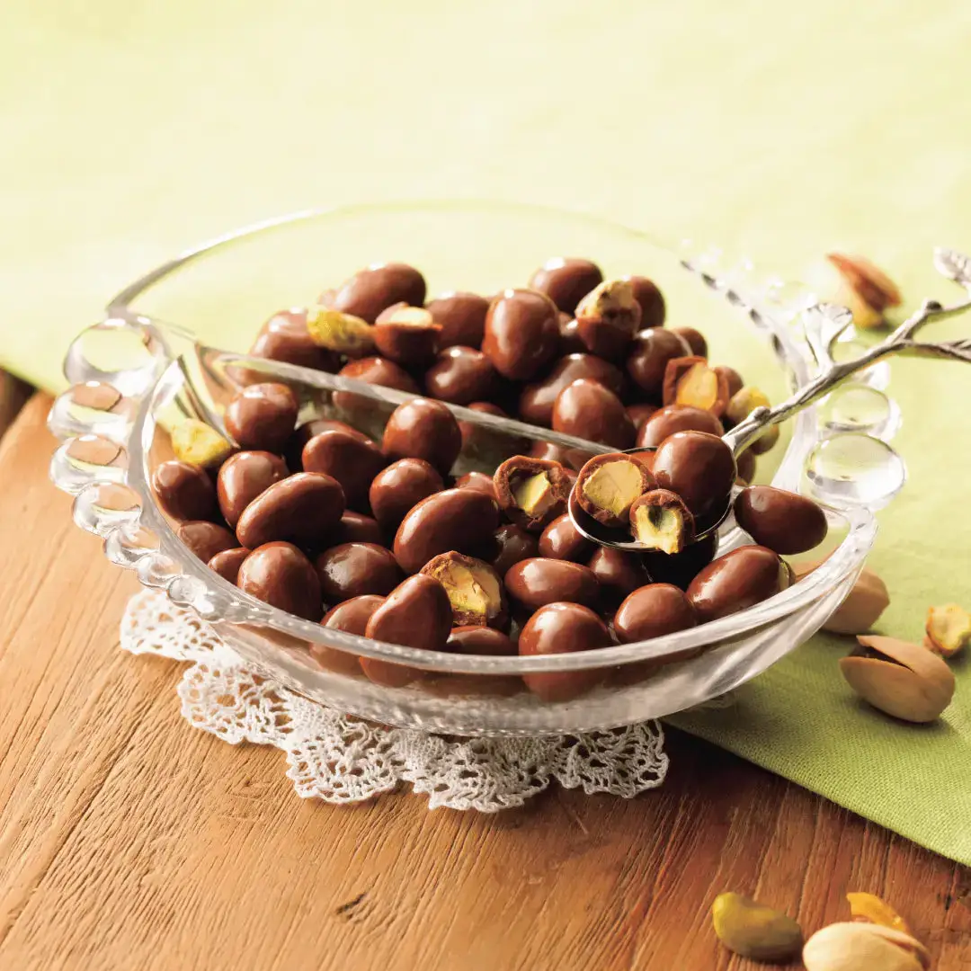 Whole California pistachios coated with lightly sweetened chocolate.